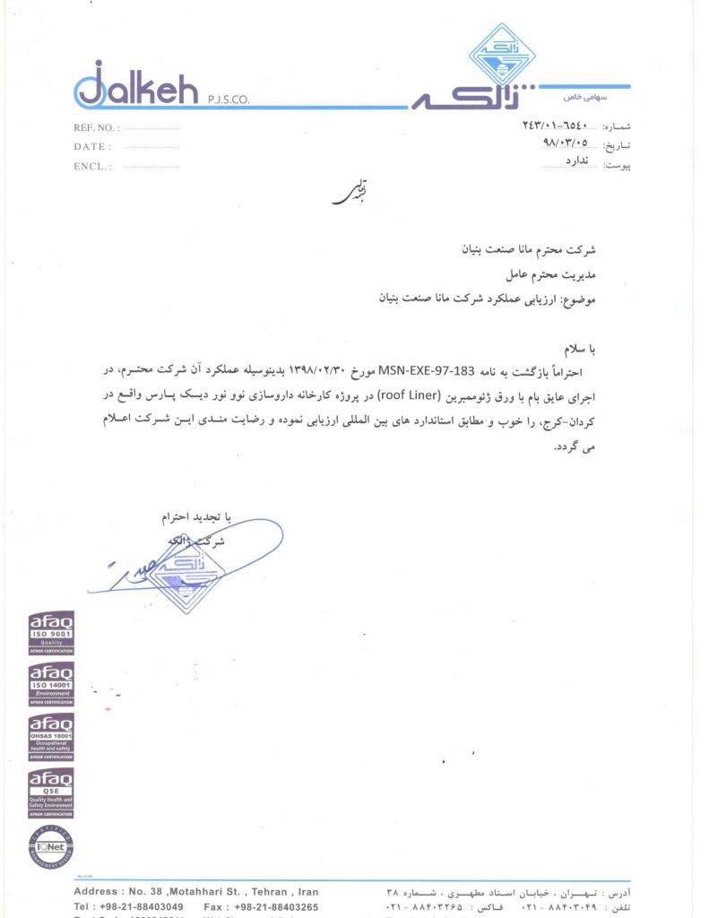 دریافت نامه رضایتمندی شرکت ژالکه